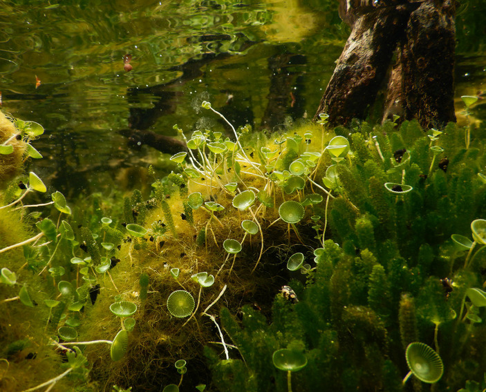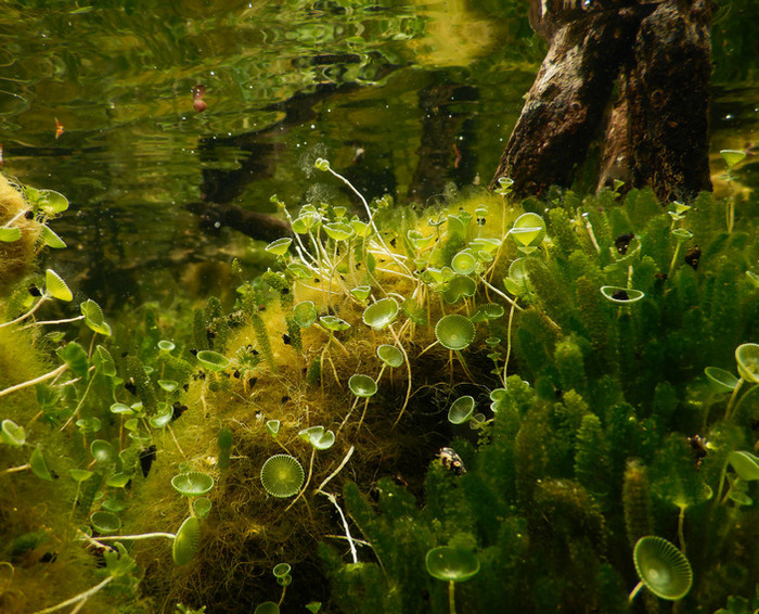 Заросли ацетабулярии и других водорослей (например, Batophora oerstedii) в пруду с соленой водой на Багамах. Фотография из сообщения S. A. Woolbright, H. A. Birchfield, 2019. Mermaids move inland