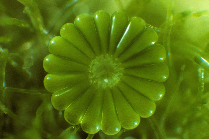На этом фото вы видите колонию одноклеточных водорослей ацетабулярий Acetabularia jalakanyakae, найденных у Андаманских островов в Индийском океане и недавно описанных индийскими учеными из Пенджабского университета (Central University of Punjab) во главе с Феликсом Бастом (Felix Bast). Клетки этой водоросли вы можете рассмотреть в деталях: каждый зеленый зонтик с ножкой — это отдельная клетка. Cвое родовое название ацетабулярия получила за вогнутую форму зонтика, напоминающую чашу: acetabulum — это чаша с уксусом, в которую древние греки и римляне макали еду. Именно поэтому ацетабулярию также называют «бокал русалки». А слово jalakanyaka, от которого происходит видовое название новооткрытой водоросли, на языке малаялам (Феликс Баст — представитель индийского народа малаяли, он родом из штата Керала) как раз и означает русалку или богиню океанов.