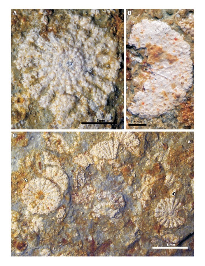 Находка Acetabularia moldavica в Румынии. A — зрелая шляпка. B — фрагмент зрелой шляпки. C — колония окаменелых ацетабулярий на камне: белой стрелкой обозначена верхняя сторона шляпки, черной — нижняя. Фото из статьи F. Baratollo et al., 2019. A new polyphysacean alga from the Miocene of Romania and its biomineralization