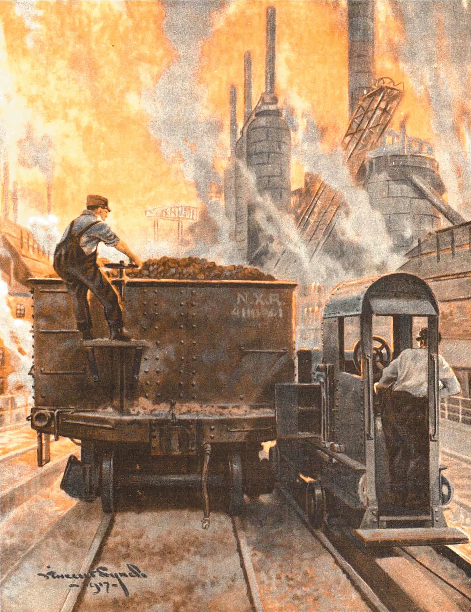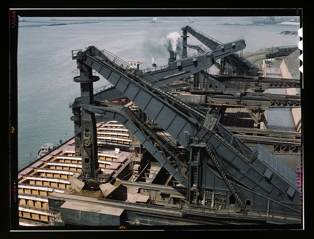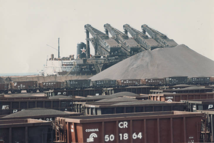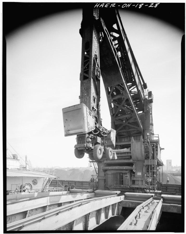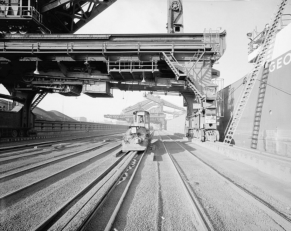 Вот, например, "мул" под разгрузчиком руды Хьюлетт (Hulett) в доках.