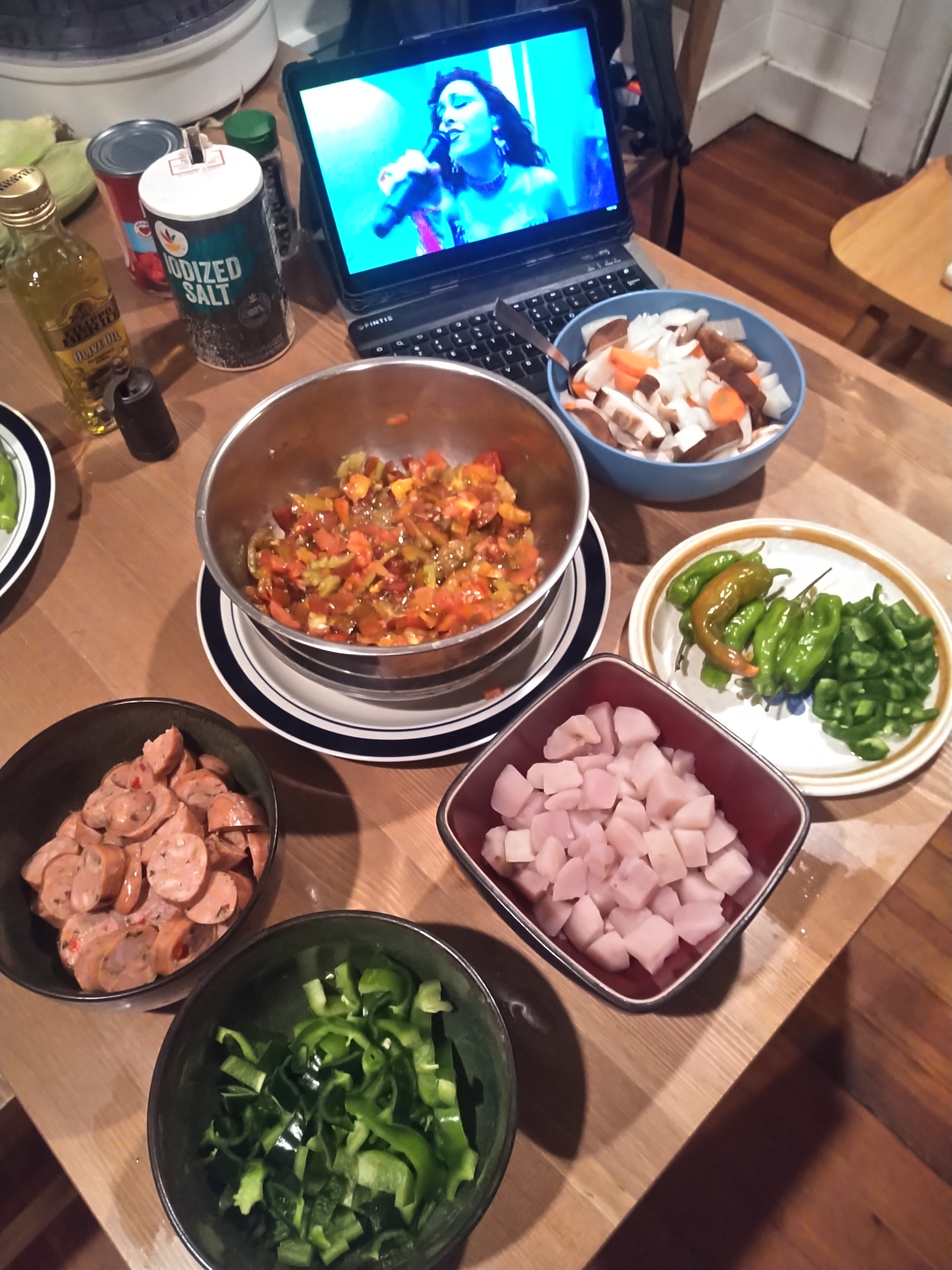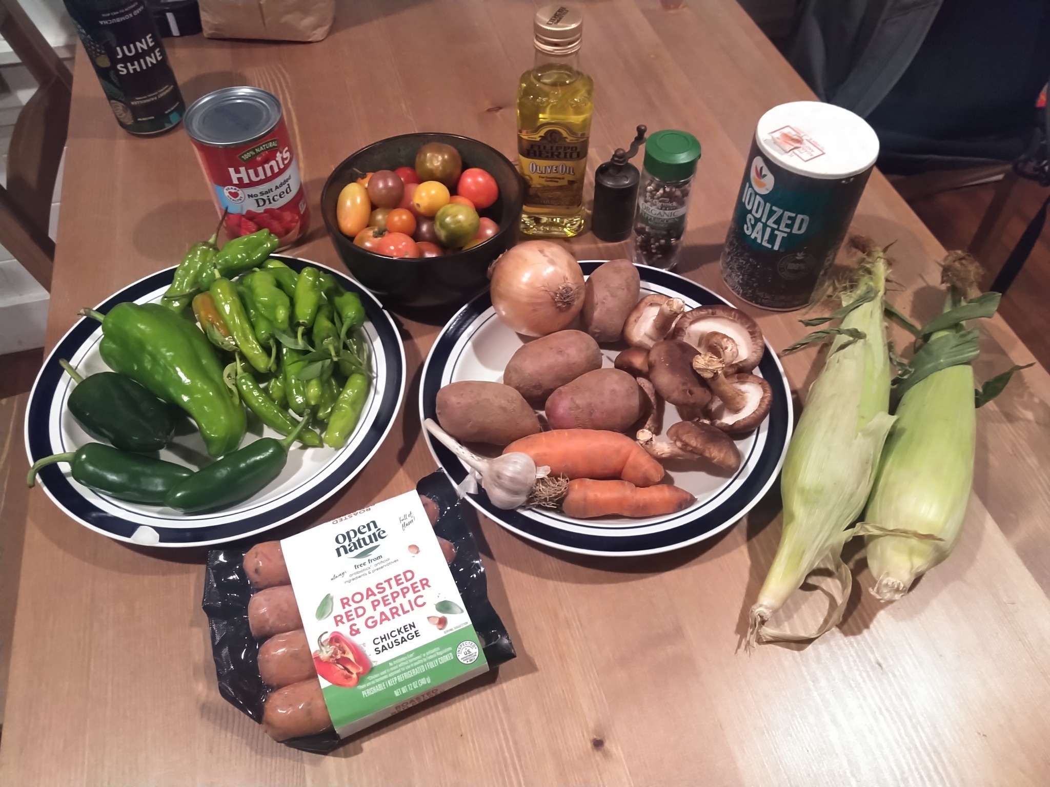 Кукуруза, которую мы приготовили отдельно. В состав входят картофель, помидоры, различные перцы, шишито, поблано и халапеньо, а также какой-то другой зеленый перец, я забыл его название, я купил все эти продукты на фермерском рынке. А также грибы и маленькая луковица. В качестве мяса мы использовали куриную колбасу, бренд, который мне очень нравится, очень хорош в омлетах или просто обжаренный сам по себе. Несколько зубчиков чеснока измельчаются, добавляются к помидорам. Картофель нарезается кубиками и варится в течение 10–15 минут, в зависимости от ваших предпочтений.