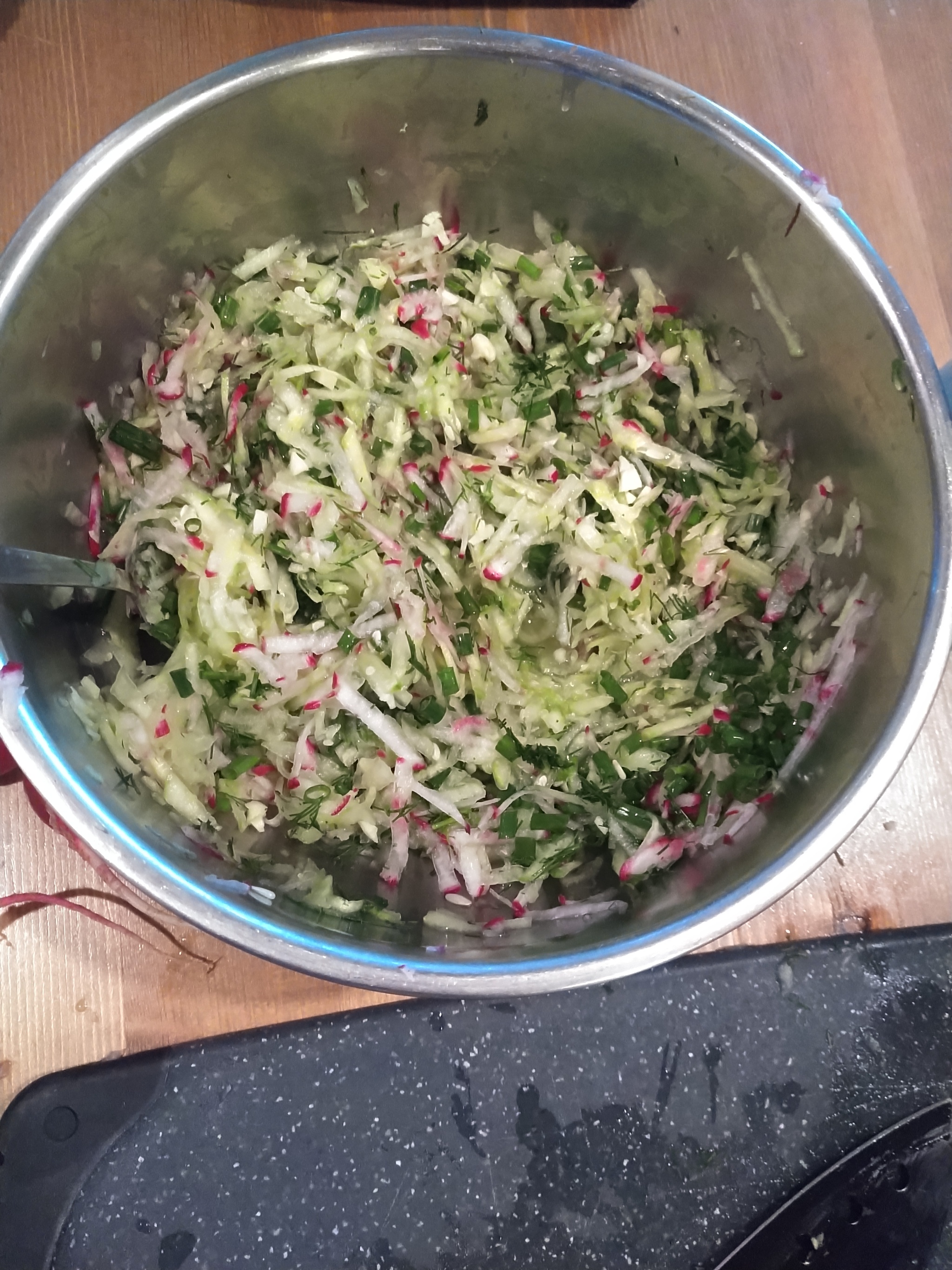 Я использовал терку для сыра, чтобы превратить огурцы и редис в тонкие ломтики, другие могут предпочесть нарезать их мелкими кубиками. В разных ресторанах делают и то, и другое, так что все зависит от индивидуальных предпочтений. Метод с теркой для сыра быстрее.