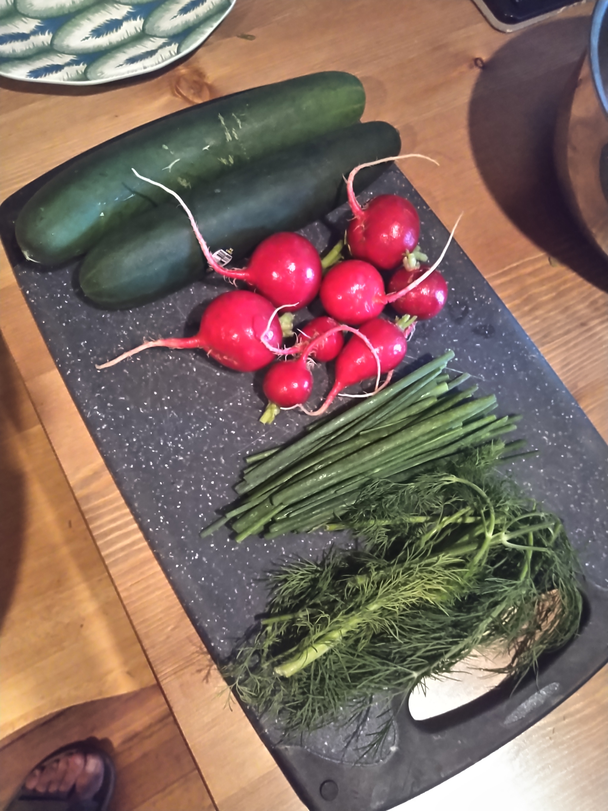 Огурцы, редис, чеснок, зеленый лук и укроп.