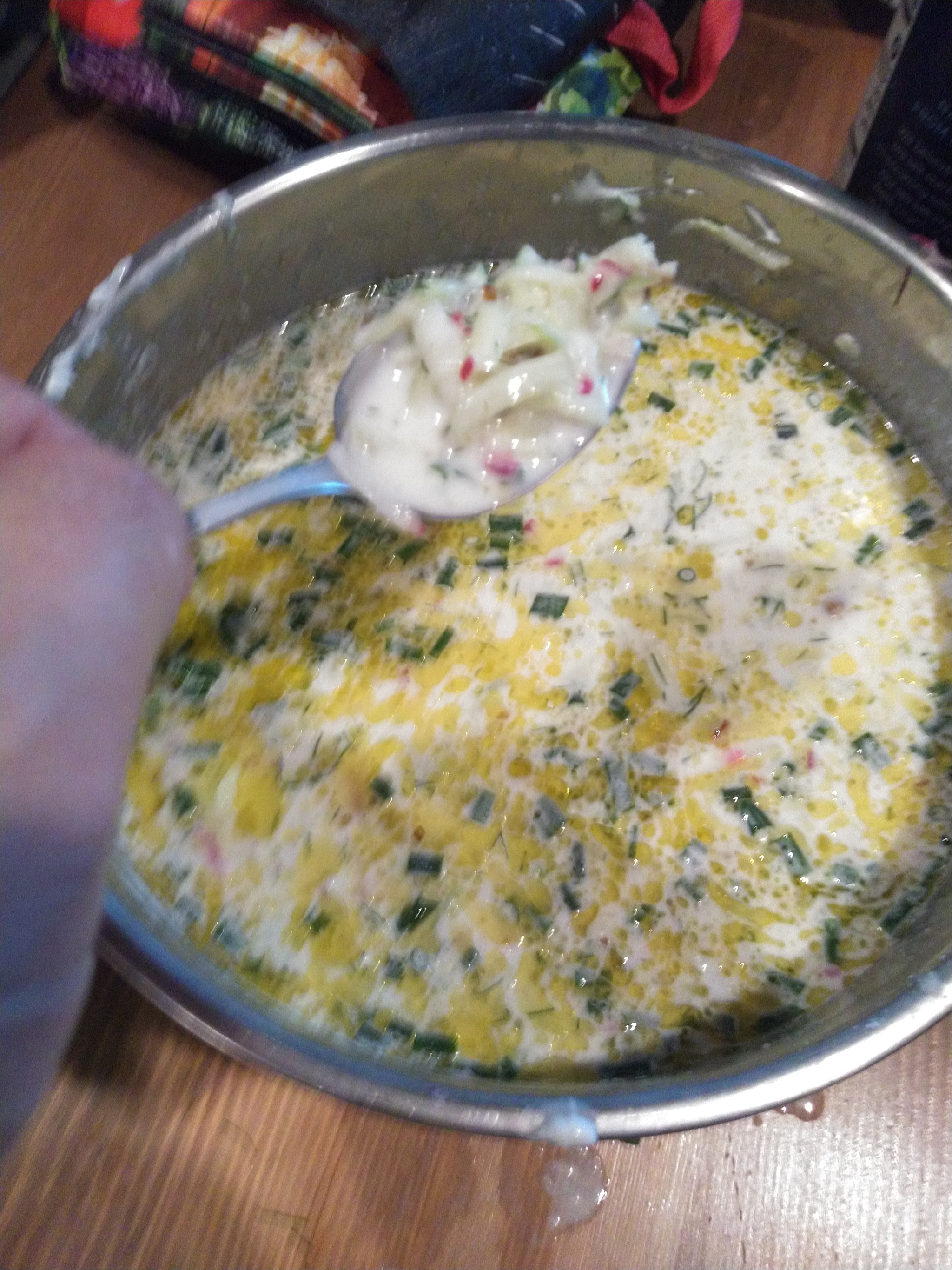 Остался только один шаг. Добавьте йогурт, немного воды и немного соли и/или перца. Стандартный размер йогурта здесь составляет чуть меньше 1 кг, поэтому я добавил его. Затем я добавил немного воды, чтобы превратить его в суп. Сколько воды добавлять, это личное предпочтение, правило по умолчанию — 3:1 йогурта к воде. Затем добавьте масло. Я добавил довольно много оливкового масла, так как я очень люблю оливковое масло, в ресторане его было бы меньше. Добавьте соли по вкусу.