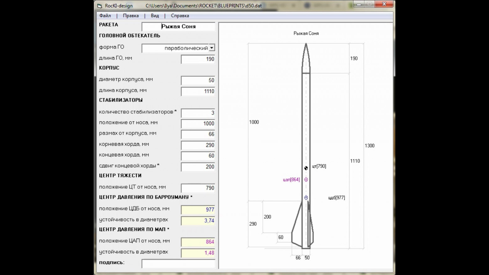 Центр тяжести ракеты определяется простым методом "взвешивания". Положив ракету на руку, нужно найти точку, в которой достигается равновесие. Центр давления рассчитывается используя метод определения центра давления по Борроумену. К слову сказать, есть и другой, хотя и куда менее точный способ определения центра давления - метод аэродинамической проекции. В любом случае, какой бы мы метод не использовали, чтобы ракета была устойчивой, расстояние между центром тяжести и центром давления должно составлять хотя бы 1,5 диаметра самой ракеты. Эта, так называемая "устойчивость в диаметрах" может быть и выше, хотя устойчивость больше 2-2,5 диаметров не рекомендуется, так как в этом случае стабилизаторы будут больше, а значит тяжелее. Кроме того, большая площадь стабилизаторов приведёт к тому, что ракета будет испытывать большие боковые нагрузки, что приведёт к тому, что она будет, как флюгер разворачиваться по ветру и лететь не вверх, а вбок; в худшем случае - флаттер приведёт к разрушению ракеты в полёте. Подробно об устойчивости можно почитать здесь - http://kia-soft.narod.ru/interests/rockets/theory/stability/....
