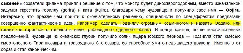 – …сроки, уважаемый, больше всего меня интересуют сроки! Вы много и красиво рассуждаете про наш национальный эпос, сказания и легенды, а до сих пор не удосужились чётко прописать в сценарии вид кайдзю. Как это прикажете понимать: «…внешне Годзира выглядит как гибрид гориллы и кита»? У нас фильм ужасов, а не комедия, Сигеру! Вы представляете себе реакцию зрителей: перед ними на экране кривляется кит с волосатыми руками? Нет, и слушать не хочу! Ах, у вас есть и другие варианты? Как? Гигантский осьминог? А как он будет ходить по суше? Ездить на трёхногой машине, как у того фантаста-англичанина? И ничего смешного тут нет, господин Каяма!