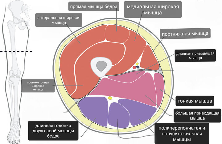 Поперечный срез бедра. Вверху передняя поверхность, внизу - задняя. Справа медиальная. Слева латеральная. Беленькое пости в центре - бедренная кость. Очень удобная картинка: красным нарисована передняя группа бедра, фиолетовым - задняя, а медиальная - розовым. И видно, что медиальная группа находится по большей части сзади. 😁