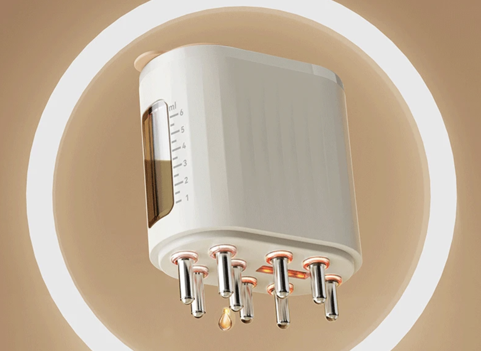 Массажер мягко воздействует на кожу головы вращающимися насадками. Красный свет добавляет лёгкое прогревание.