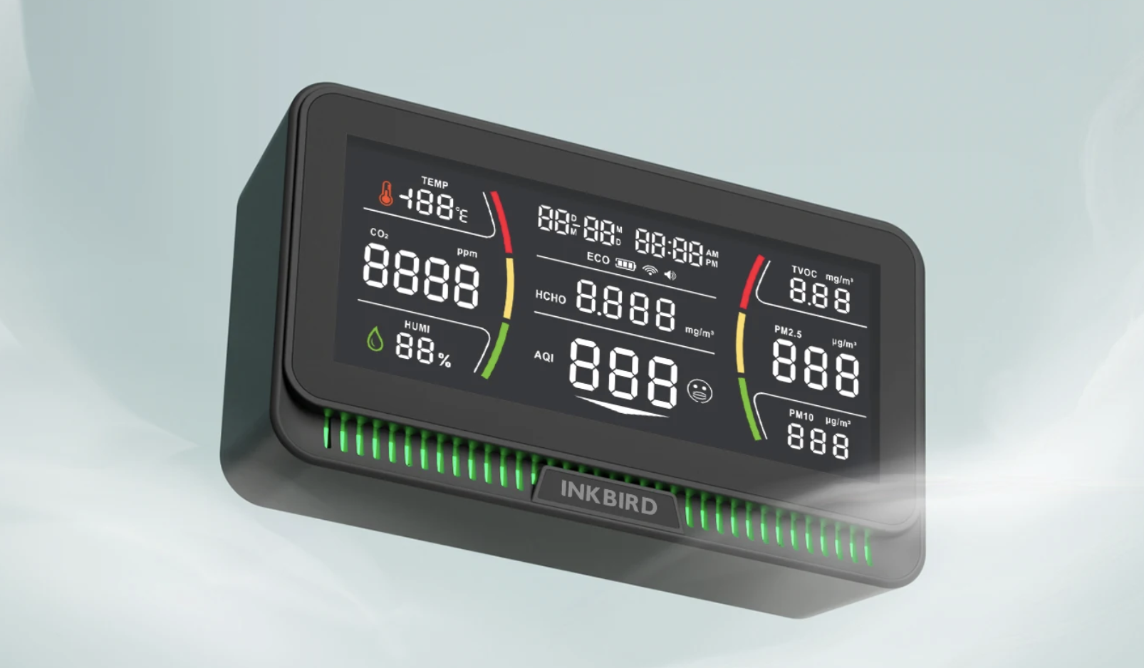 Универсальный прибор для контроля атмосферы в помещении. Он измеряет CO₂, PM2.5, температуру, влажность и другие параметры, отображая результаты в приложении и на экране.