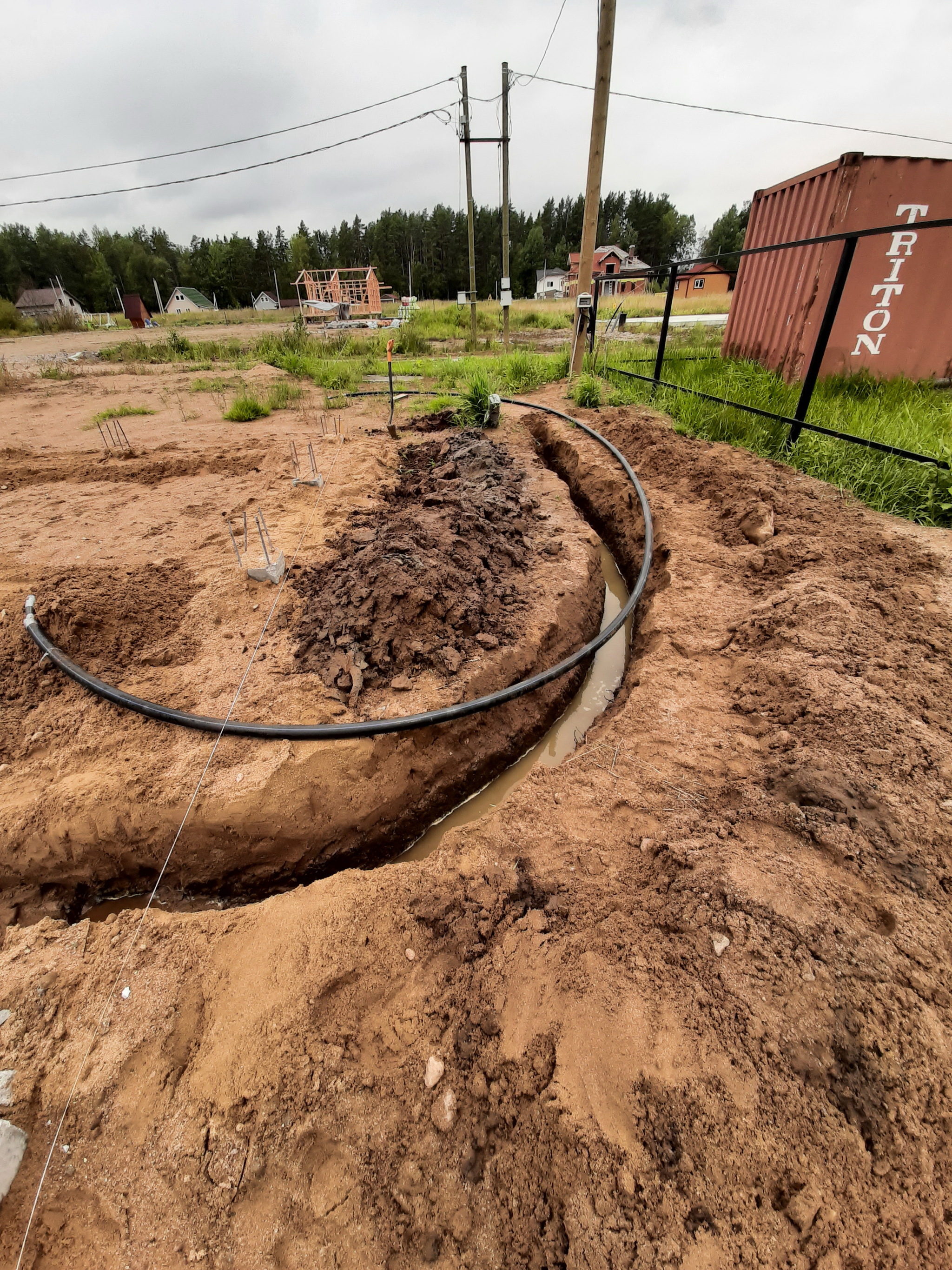Закопал трубы канализации и ввода воды. Для ввода воды использовал ПНД трубу 50мм для внешней оболочки и 32мм для воды