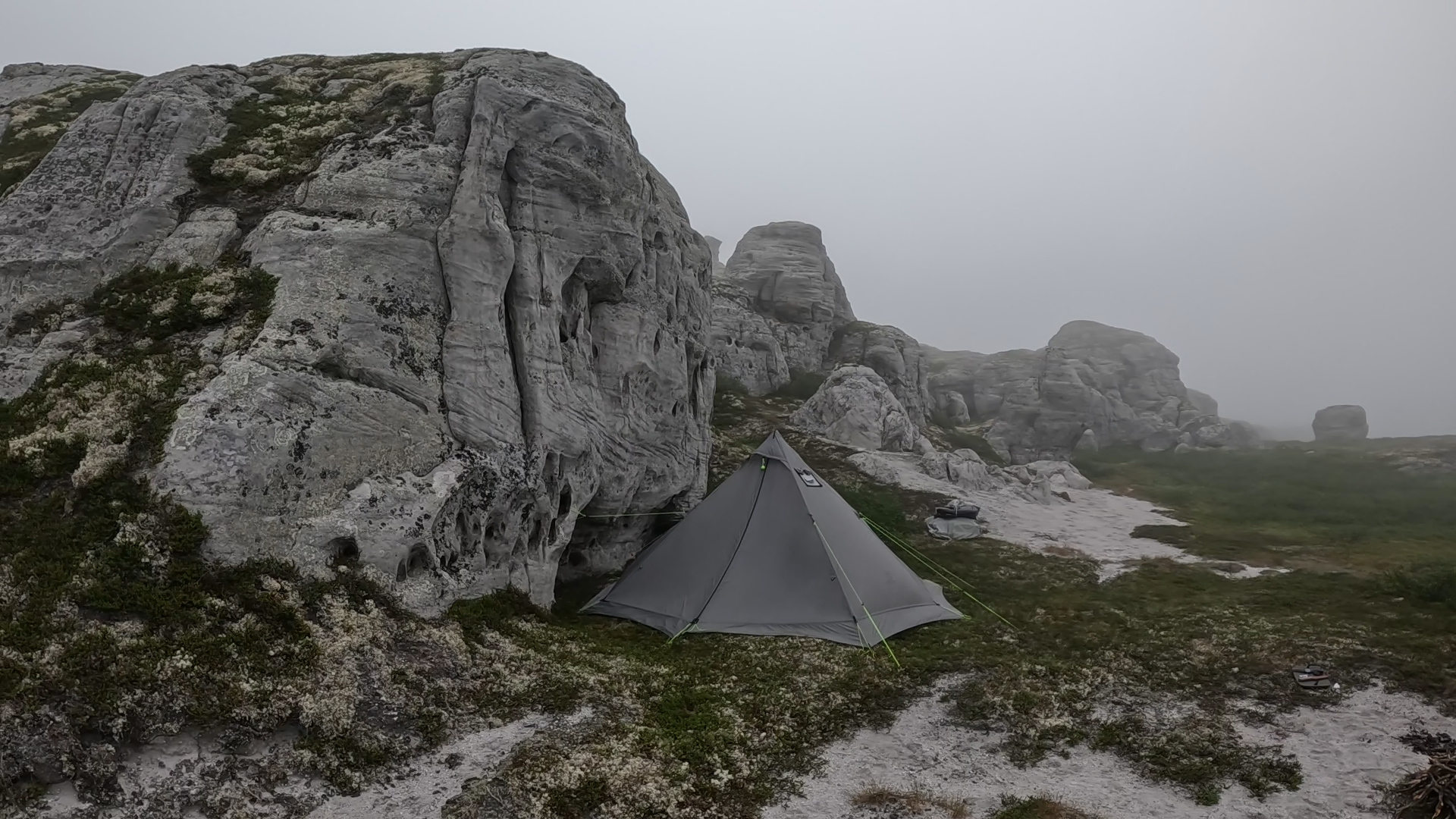 Ночью было ясно и уже традиционно холодно, а утром проснулись в густом облаке, которое обильно выпало на палатку. Сильный ветер метёт туман струями, останцы в таком тумане выглядят загадочно и как-то мистически.