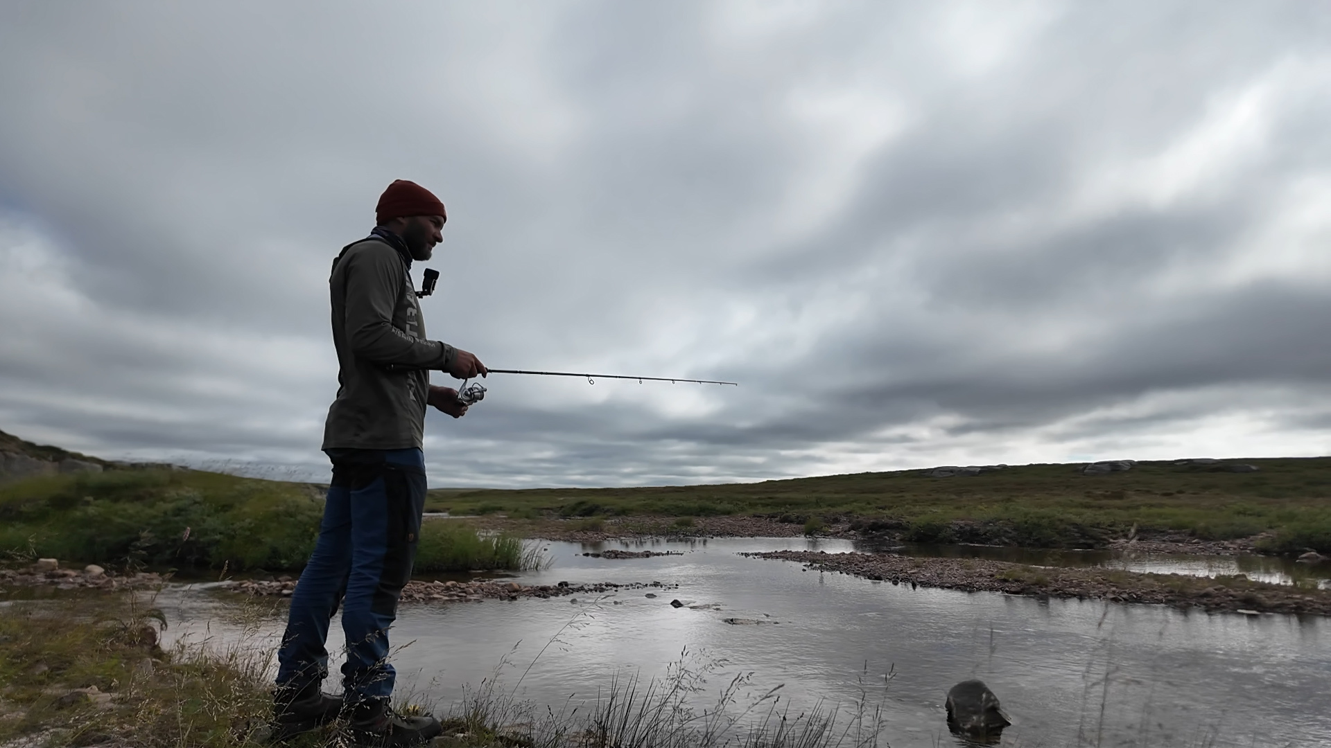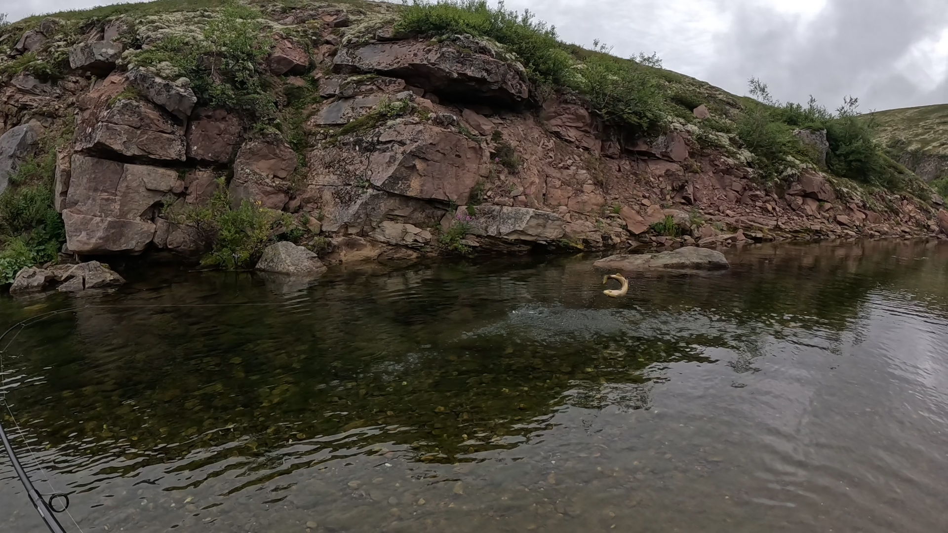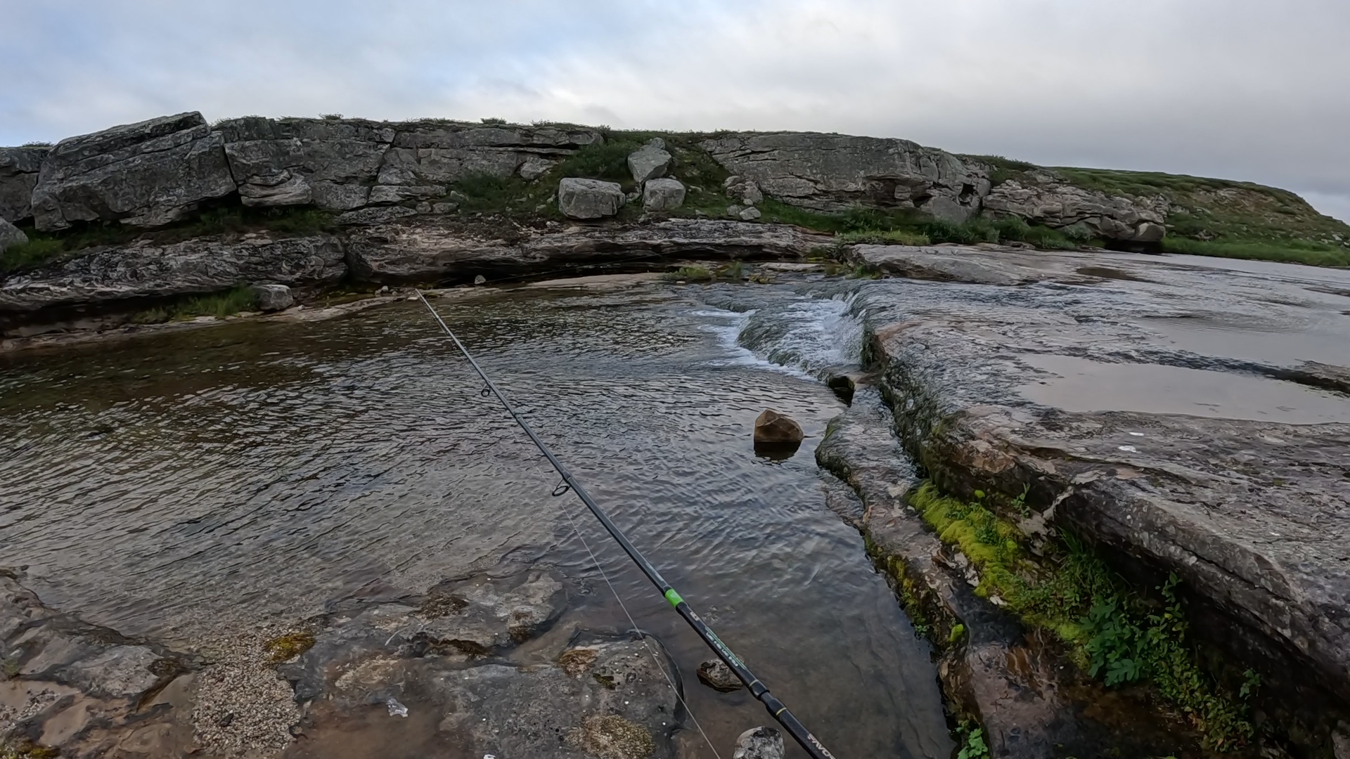 Наконец выбрались из каменного лабиринта и вышли к Белому Кечвожу. Река здесь ещё мелкая, но Тарас решает побросать спиннинг — а вдруг!