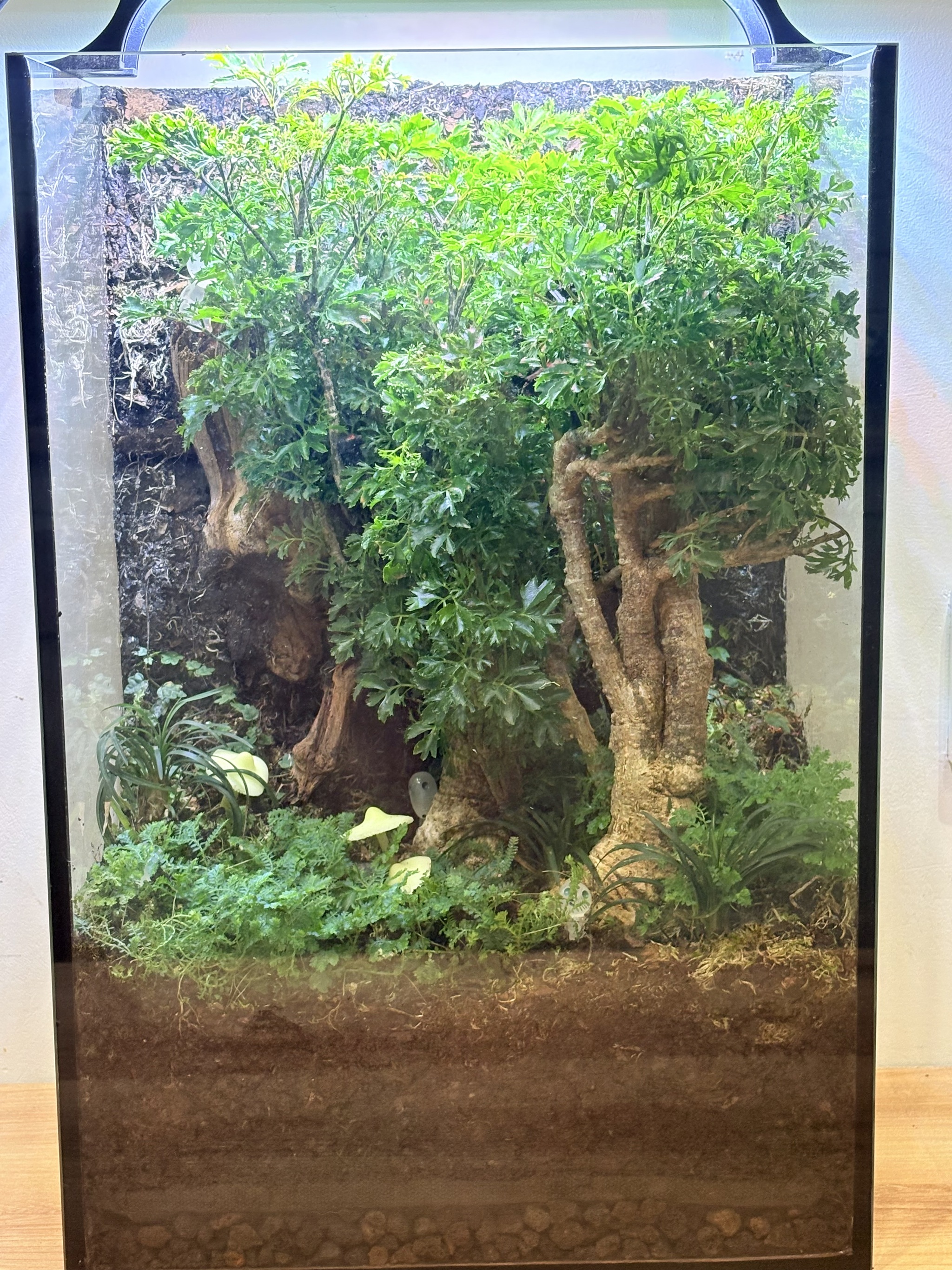 - Высаживаем растения. Здесь использовались: Полисциас фрутикоза (который большое дерево), фикус Пумила Грин Санни (который по задней стенке будет ползти), внизу - Офиопогон японский карликовый и Селагинелла Унцината, Папоротник Нефролепис