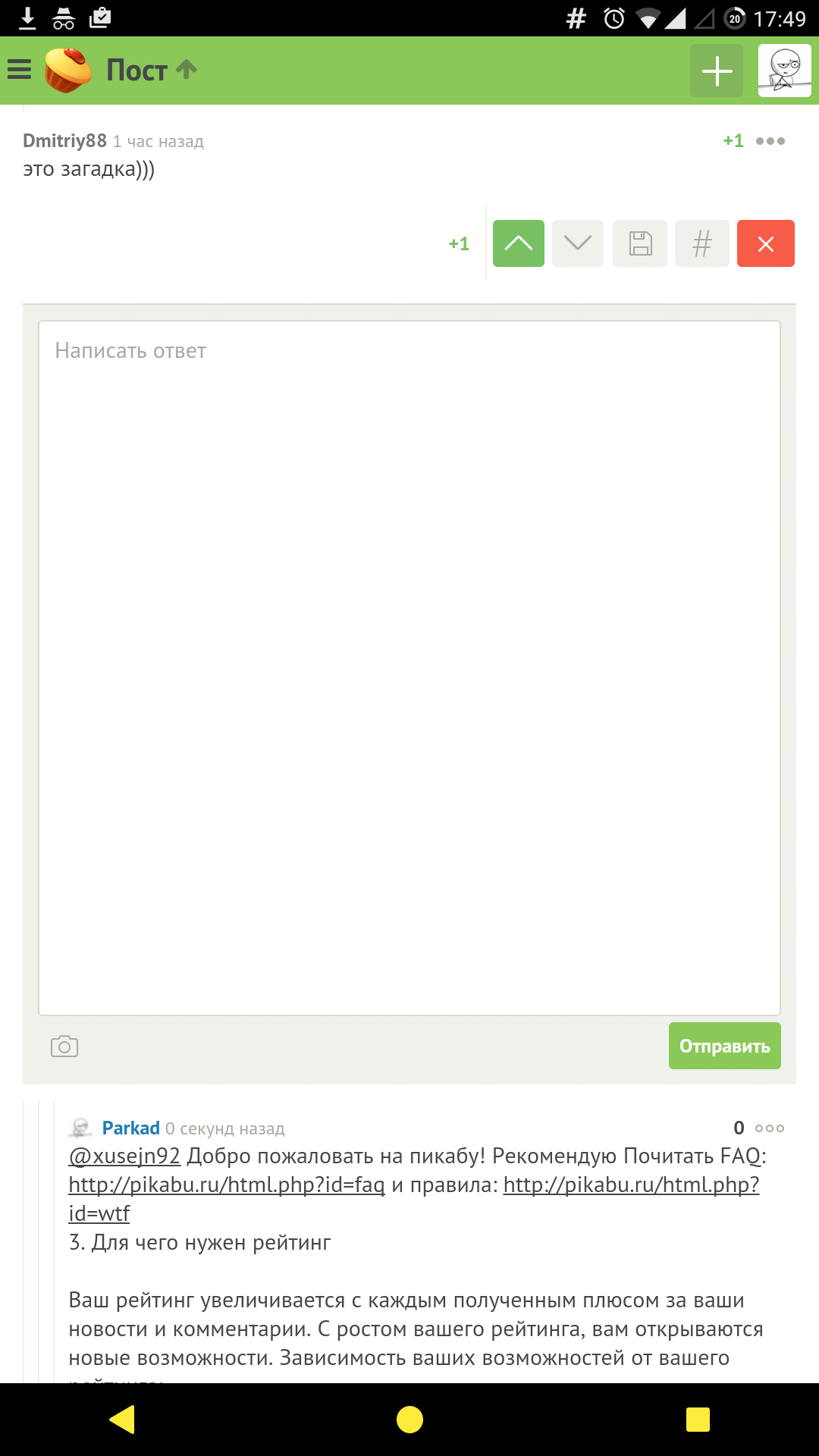 Parkad Багрепорты Большой коммент. 9 лет назад Только что написал и отправил большой коммент. После этого, при ответе тому же пользователю появляется слишком большое поле, что, как мне кажется, не есть хорошо. На скрине понятней. [моё] Баг на Пикабу Баг или фича Ввод Длиннопост