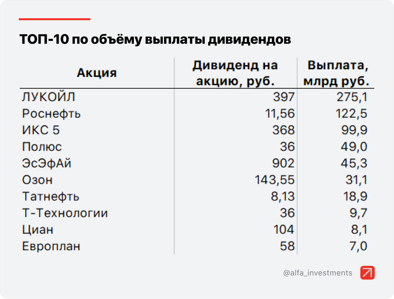 Объём выплат в абсолютном значении составит примерно 680 млрд руб. Основной вклад внесут крупнейшие компании, такие как ЛУКОЙЛ, Роснефть и ИКС 5. Только эти три эмитента распределят своим акционерам около 500 млрд руб.