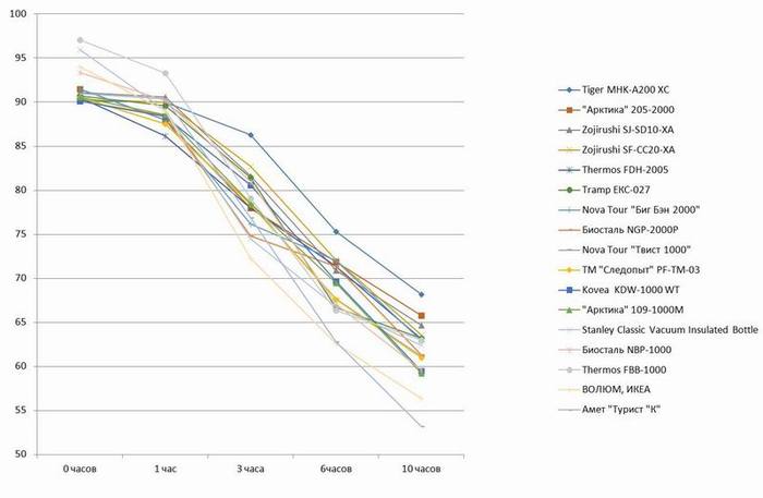Довольно любопытно наблюдать на диаграммах, как снижается температура жидкости в термосе спустя время. Прилагаю два графика потери температур в тестах. На первом графике видно, как снижалась температура при замерах через 1, 3, 6 и 10 часов после заливания кипятка в термосы.