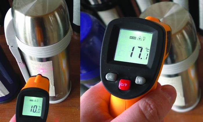 Первый тест эмулировал частое пользование термосом: температура была замерена сразу после заливки посуды кипятком. Следующие замеры проводились через 1, 3, 6, 10 часов. Все данные заносились в таблицу, которую можно будет увидеть в конце материала.