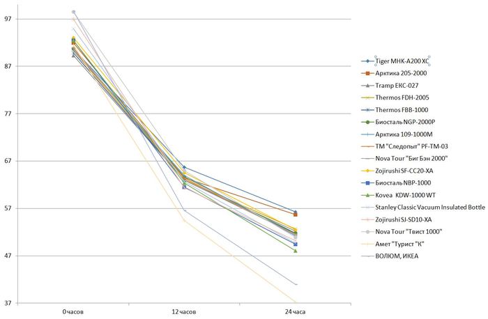 Второй тест моделирует ситуацию, когда термос должен долго хранить тепло. Поэтому производилось всего три замера температуры: в момент заливания кипятка, через 12 и через 24 часа. Таким образом, я получил данные о том, насколько вообще термос может сохранить температуру жидкости за сутки.