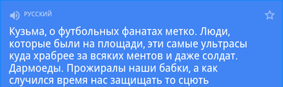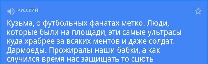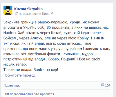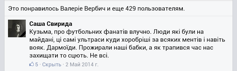 Стоп-стоп. Где он тут "выражает поддержку футбольным фанатам, которые подожгли дом профсоюзов"? Это совсем другая цитата. Вообще, судя по его фейсбуку, он выступает против войны и не любит Путина. Вполне логично, украинцам сейчас Путина любить действительно не за что, на Донбассе русские добровольцы и "добровольцы" украинцев на компост отправляют, а не негры из Сомали. С другой стороны, Порошенку с Тимошенкой он не любит ещё больше, и тоже хуесосит их почём зря. Поэтому есть у меня мнение, что имеем мы дело с самой примитивной пропагандой, цель которой путём подмены фактов подкинуть ещё дровишек в костёр взаимной ненависти, чтобы горел поярче - в отбрасываемой им тени серьёзным джентльменам очень удобно решать не предназначенные для лишних глаз вопросы.
