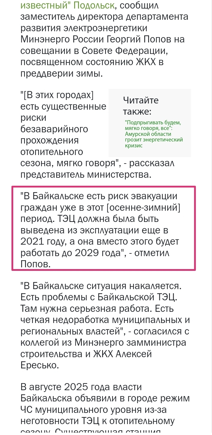 Ну так то ТС редкосная какашка, вроде правду сказал, но не всю, и во вторых-где он там про эвакуацию увидел, не спиздить не разогнять хайп, да ТС? "В этих городах с учетом анализа планов ликвидации аварий и их качества, а также с учетом анализа надежности и износа тепловых сетей и источников теплоснабжения, есть существенные риски невозможности безаварийного прохождения ОЗП (осенне-зимнего периода - ред.)", - добавил Попов.