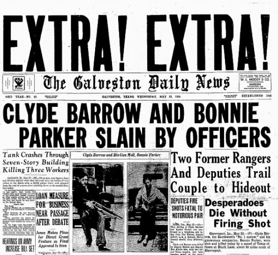 Их криминальная волна наконец закончилась в мае 1934 года, когда Фрэнк Хамер, техасский рейнджер, и его отряд выследили Клайда и Бонни в Луизиане. Группа устроила засаду , укрывшись на обочине дороги. Когда они увидели машину Бонни и Клайда, отряд выпустил град из более чем 100 пуль, убив обоих пассажиров машины.