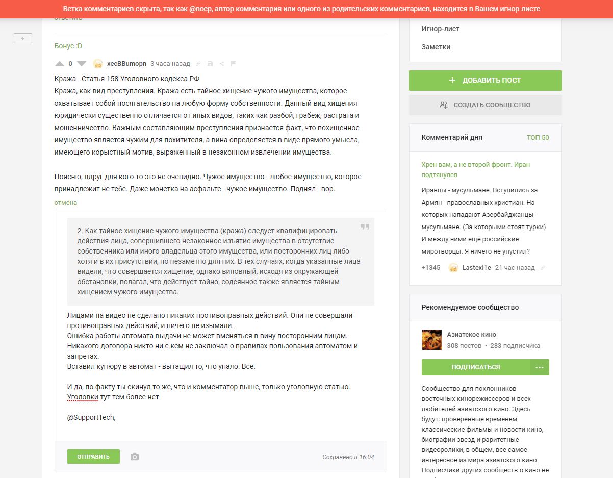 Я не могу ответить пользователю на его коммент потому, что кинул в игнор другого пользователя.