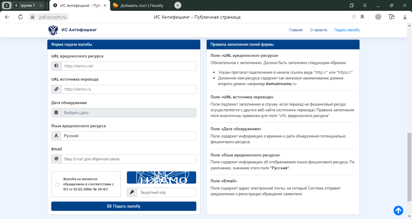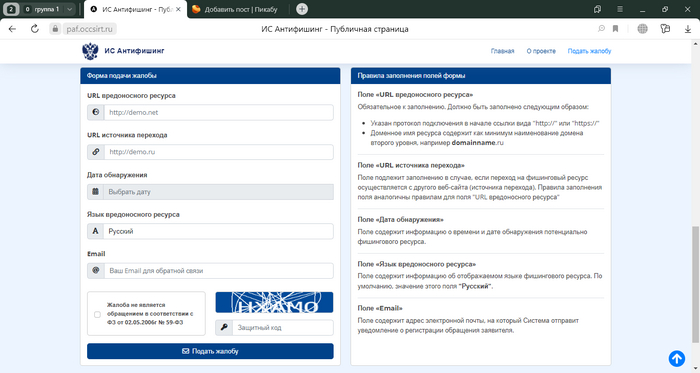 Теперь по адресу https://paf.occsirt.ru/ можно заполнить небольшую форму и вредителя должны заблокировать
