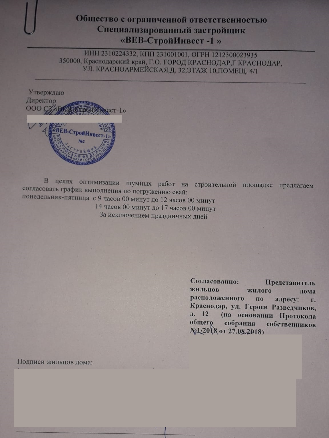 Интересно, что пока мы этот лист не подписали, они вообще сваи не забивали, ну и напоследок администрация решила уведомить нас что они постарались