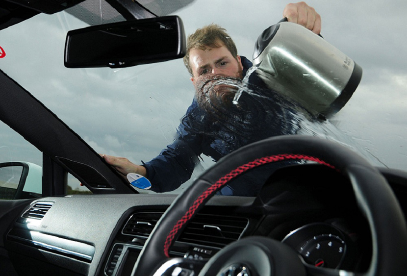 Чтобы вернуть стеклу прозрачность без каких-либо потерь, лейте в емкость (лучше пластиковую бутылку) не кипяток, а теплую воду из-под крана. Температура должна быть такой, чтобы вода не обжигала руку, то есть не более 50°С. К тому же, пока вы облачитесь в верхнюю одежду и дойдете до своего парковочного места, вода немного остынет. Вам останется равномерно полить лобовик сверху вниз, не пропуская ни одного обледенелого участка. Таким способом вы быстро растопите или разрыхлите образовавшийся лед, остатки которого затем можно убрать щеткой или скребком.