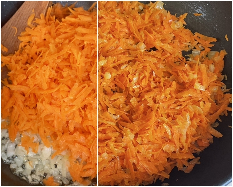 Перемешать. Деликатно. Так, чтобы лепестки морковки перемешались с луком и маслом. Как только морковка наберет температуру масла, знаете, какой аромат приятственный начнёт распространяться? Это не передать. Это ощутить надо.