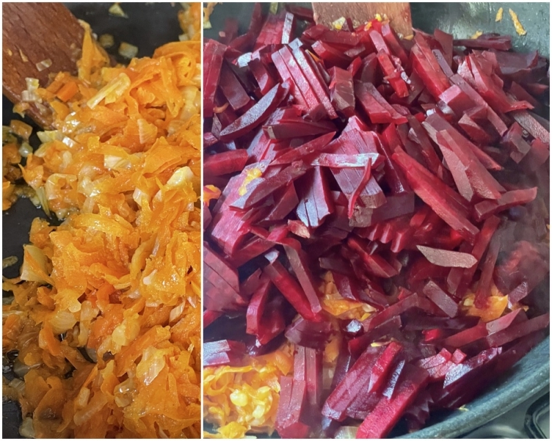 Минут через десять-пятнадцать, когда морковка смягчится, наберет в себя маслянно – луковой вкусности, к внутренней сущности надо добавить свёклу.