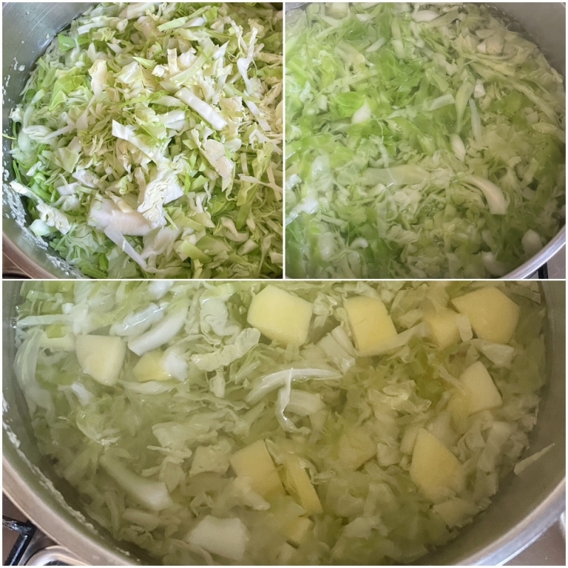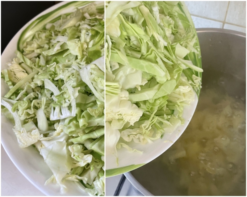 Пришло время капусты. Нашинковал я не очень большой кочан молодой капусты и высыпал ее в тот самый картофельный бульон. Пусть потихоньку варится. Продолжая держать кастрюлю на маленьком нагреве, давая лишь слегка побулькивать, сильного кипения не допуская.
