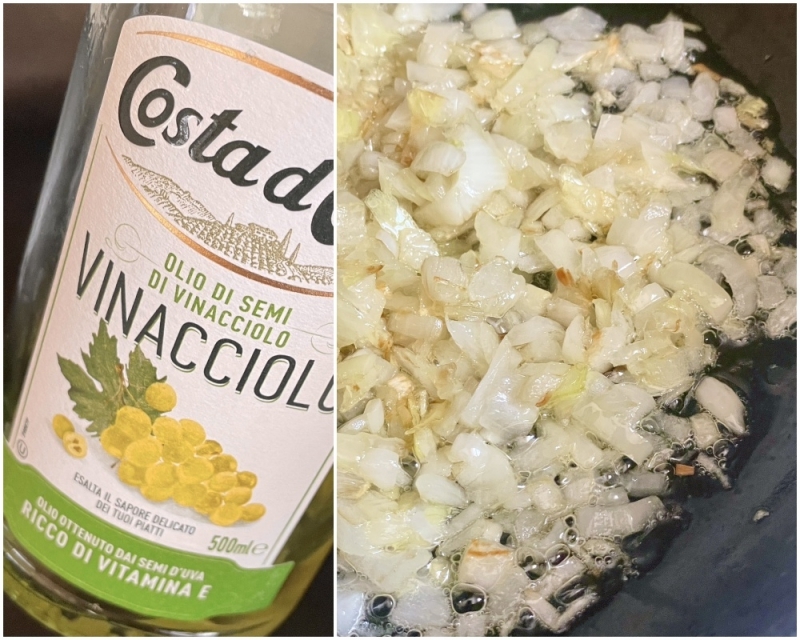 А я приступил к приготовлению собственно внутренней сущности борща. Надо взять хорошее, вкусное растительное масло. Я предпочитаю масло из виноградных косточек. Ароматное, вкусное и главное, не дает никаких посторонних привкусов и ароматов при нагревании, или даже, вернее сказать, при накаливании на сковороде. И отлично сочетается с другими продуктами в этом самом термическом процессе. Я бы сказал наполняет их, эти продукты, своим замечательным вкусом и ароматом.