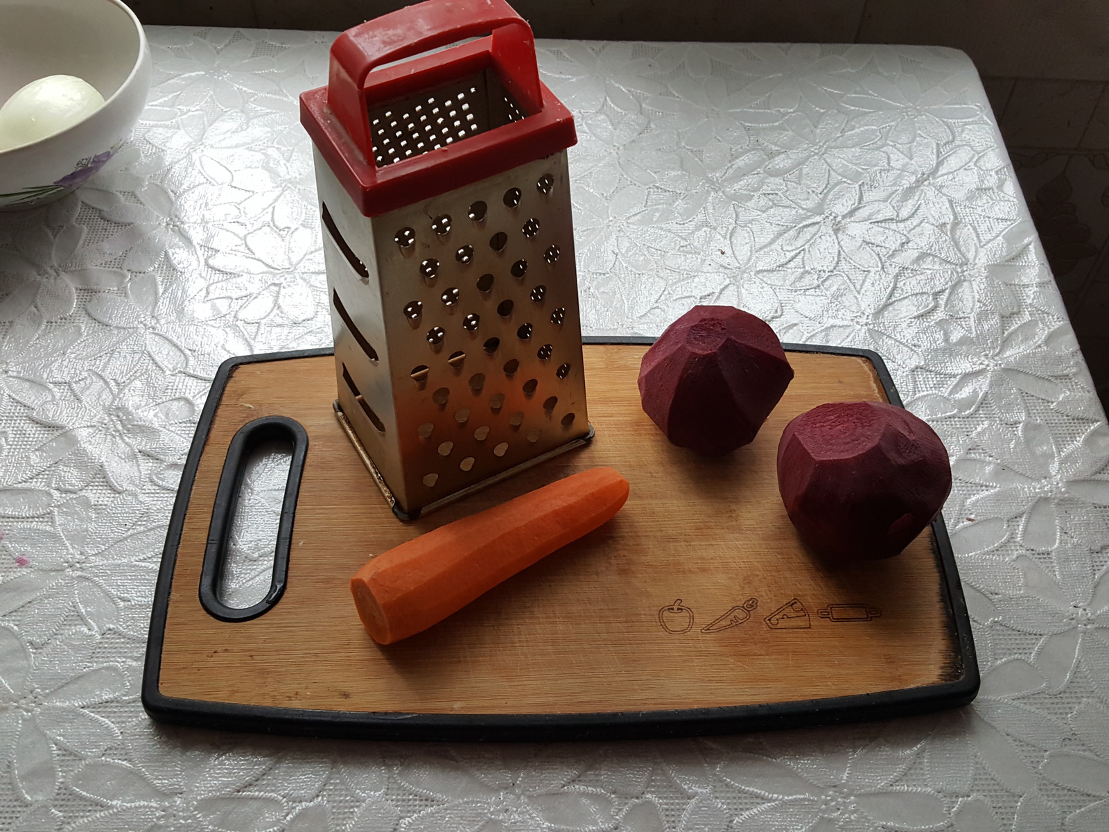 Добавляем политую лимонным соком свеклу, добавляем в нее ложку томатной пасты, немного соли, столовую ложку сахара. Зачем сахар не знаю. Так Интернет сказал. =)