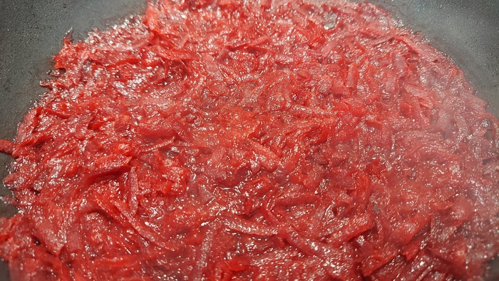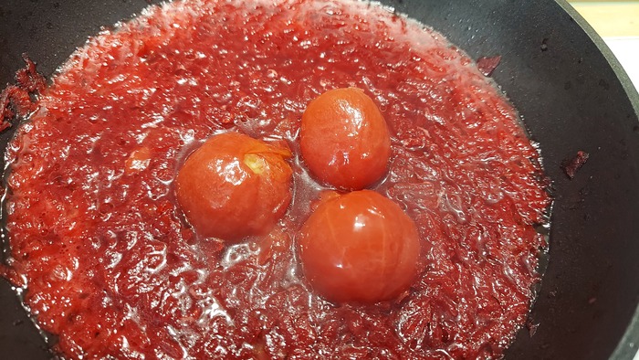 Потом вспоминаем про томатную пасту, а вернее её отсутствие. В магазин уже идти в лом, поэтому фигачим туда маринованные помидорки маминого производства. Без кожуры естественно.