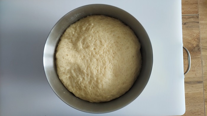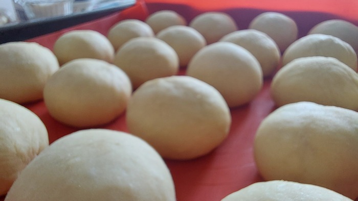 Достаем тесто и делим его на кусочки по 50 грамм. Кусочки катаем в шарики и всё это под плёночку или влажное полотенце.