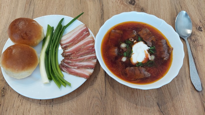 Режем сало, зелень, достаем сметанку и накладываем суп, а в него добавляем ранее сваренное мясо. Пора есть!