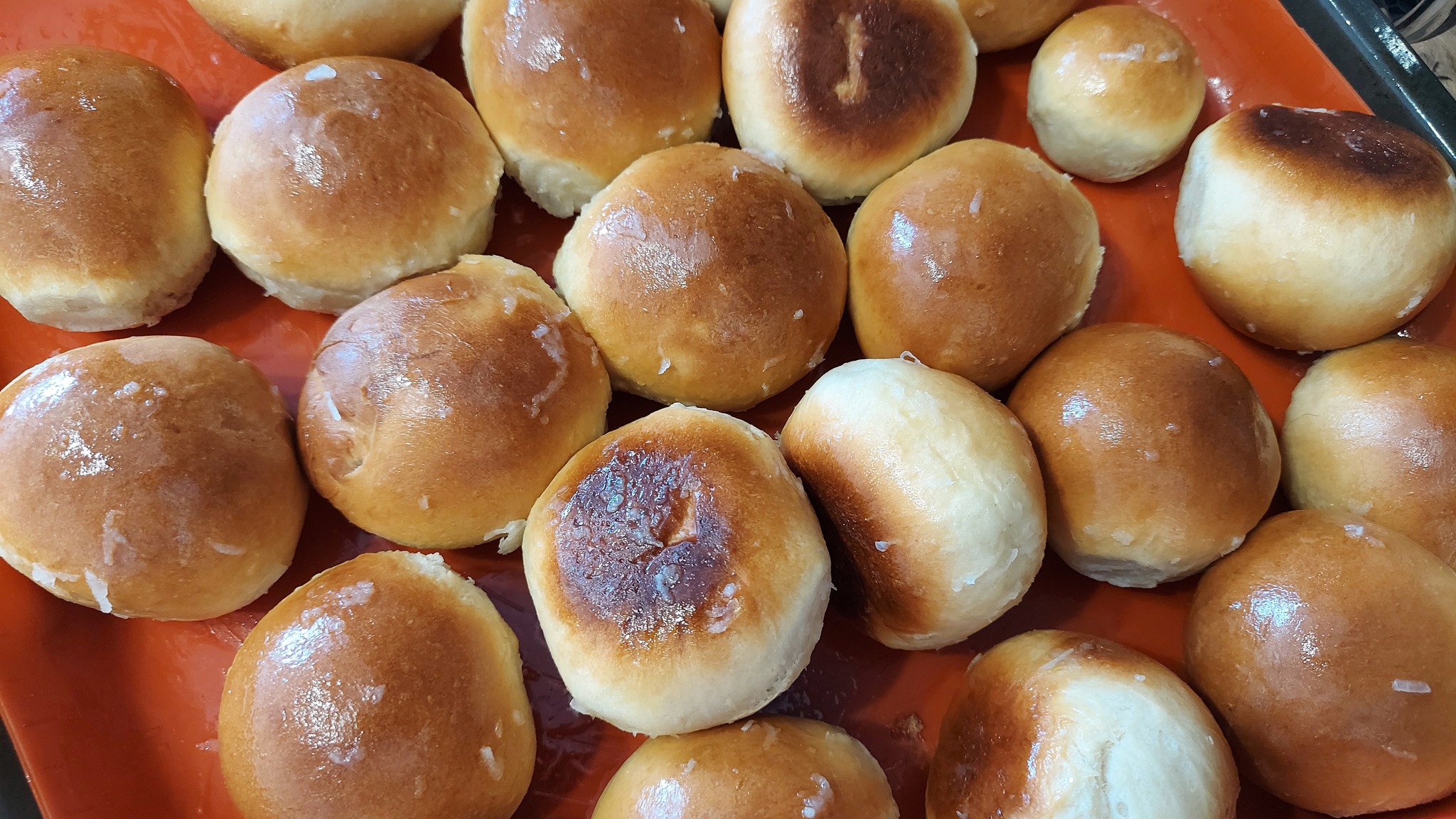 Духовка согрелась, заряжаем в неё противень с нашими колобками (я убираю на самый низ духовки), они чуть-чуть подросли и готовы к выпечке. Переключаем на подогрев снизу и ставим 180 градусов. Через 13 минут включаем вентилятор и подогрев только верх. Еще через 3-4 минуты ставим 250 градусов на верхней ТЭНе и припекаем до желаемого цвета. Я минутку подержал и мне хватило.