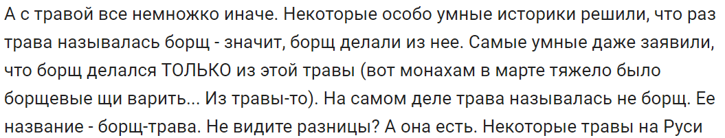 Написал недавно @Zeluch пост о борще, и меня попросили его прокомментировать. В посте автор путём цепочки рассуждений приходит к выводу, что изначально борщом называли квашеную свёклу. Его мнению противопоставлена гипотеза каких-то дураков-историков, которые пишут, что борщ – это первоначально борщевик: