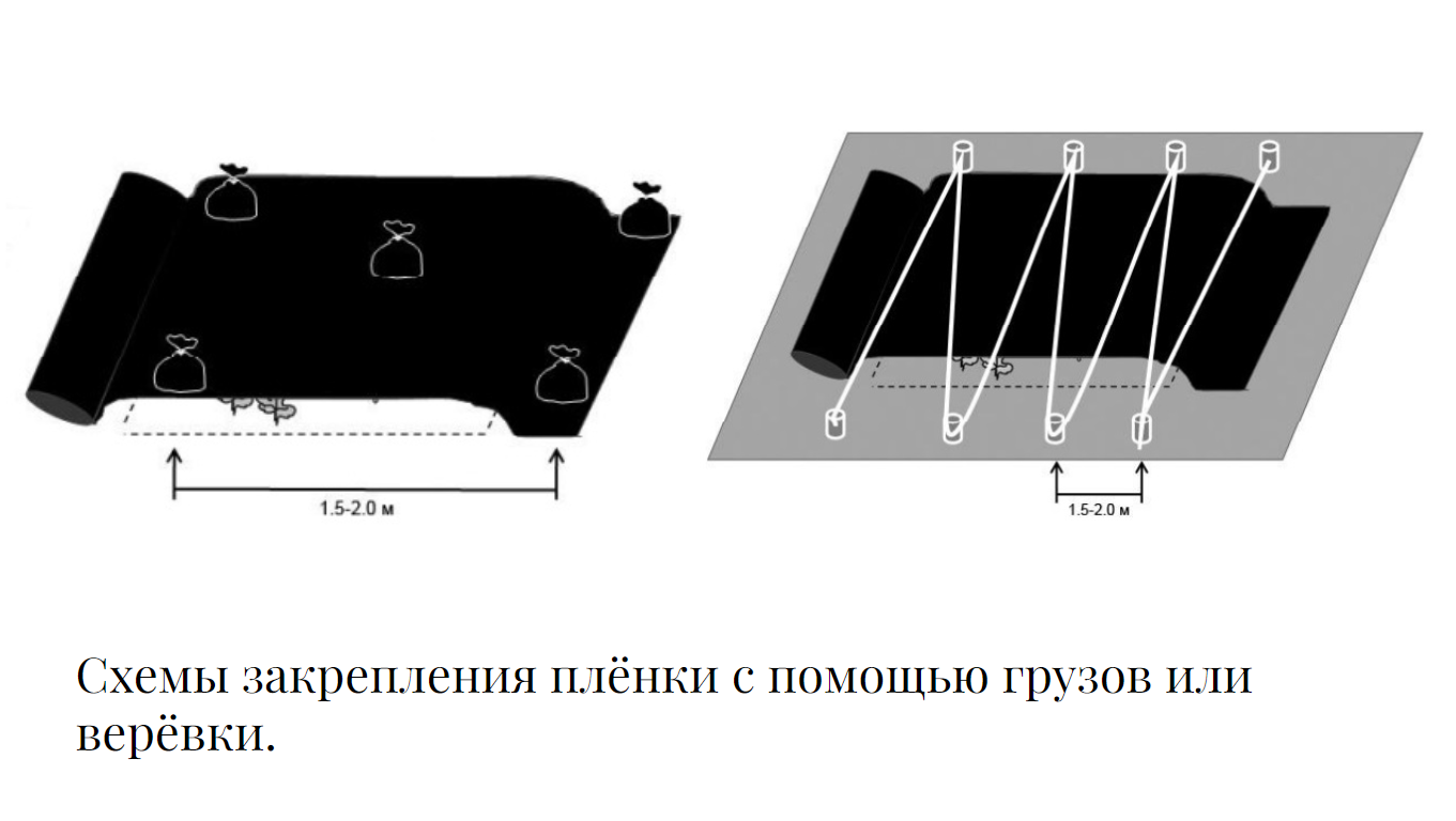 Алгоритм действий. Подготовьте поверхность (уберите крупные ветки) и расстелите плёнку толщиной не менее 100 мкм. Затем закрепите плёнку тяжелым грузом или веревкой (иначе ее будет сдувать ветром).