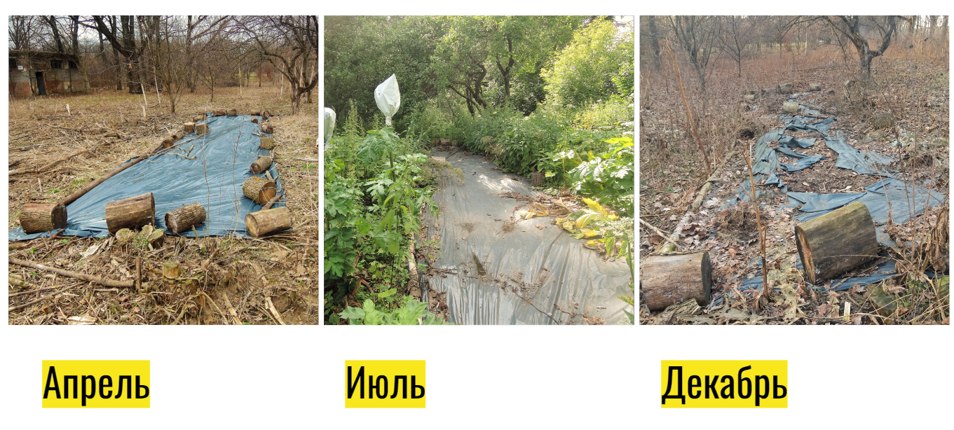 Укрывание борщевика чёрной плёнкой