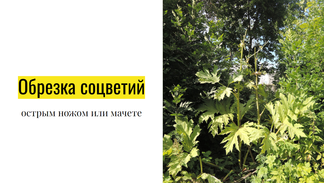 Необходимо тщательно экипироваться и аккуратно срезать цветущие зонтики как можно выше к соцветиям. Сами цветоносы и большую часть листьев оставляем. Таким образом, можно обмануть борщевик - он будет «считать», что успешно завершил свою программу и погибнет. Поскольку, мы помним, что борщевик - растение-монокарпик (цветёт один раз в жизни!).