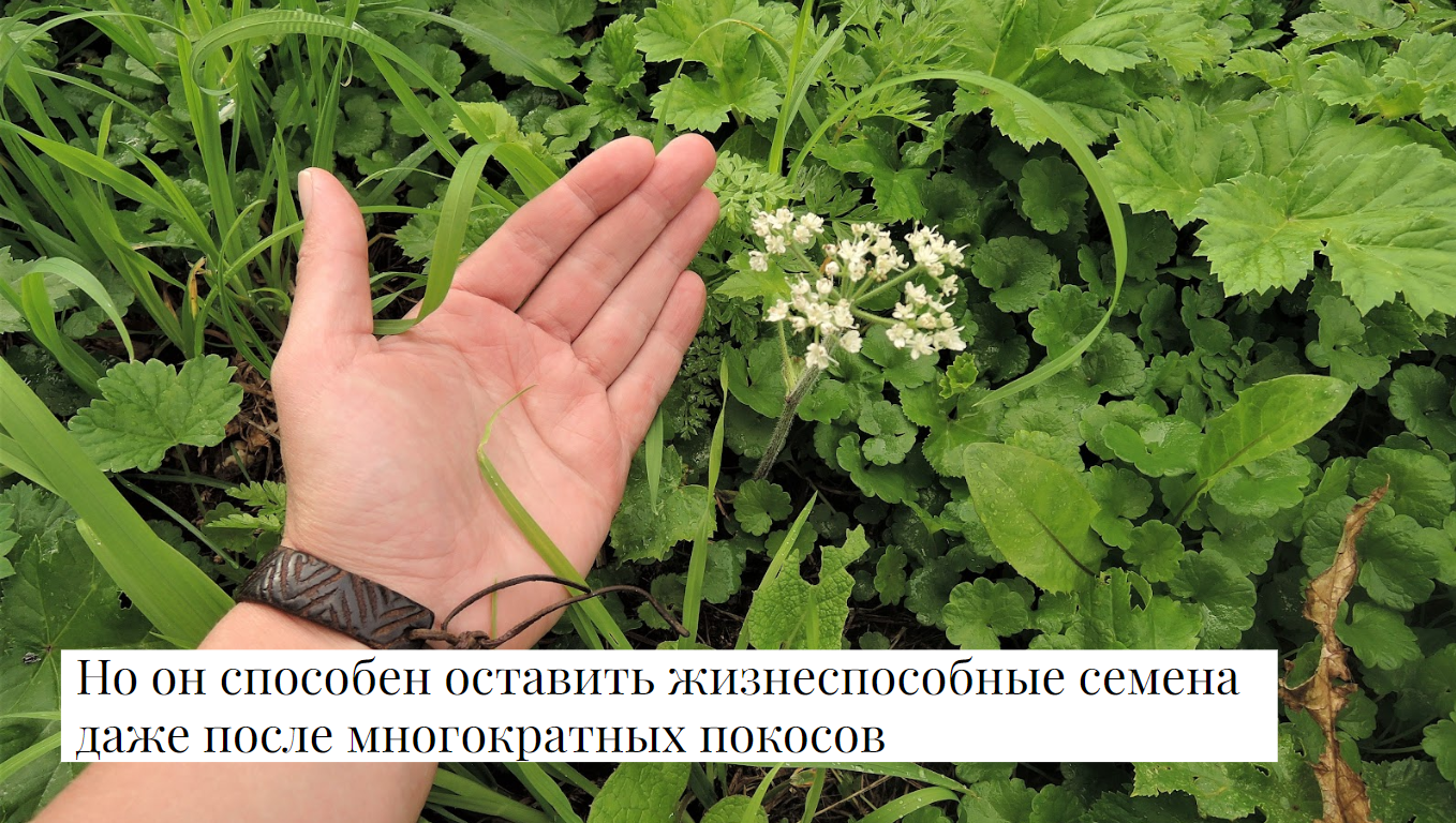 Скашивание - временный «метод сдерживания». Даже частое кошение лишь ослабляет борщевик, но не уничтожает его.