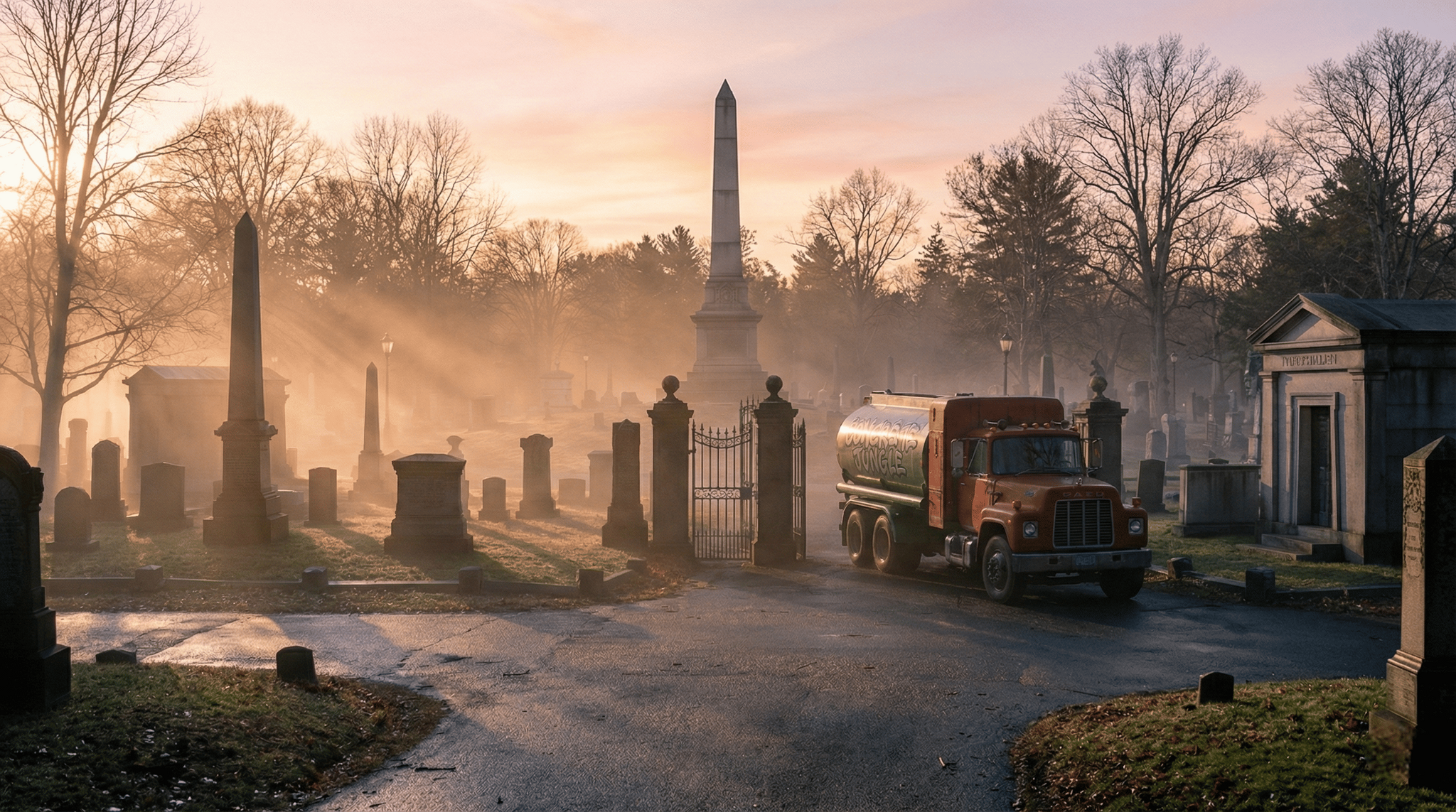 На следующее утро «Громкий Тони» припарковался у кованых ворот кладбища Форест-Хилл. Солнечный свет издевательски ярко пробивался сквозь листву, рисуя на дорожках безмятежные узоры. Парни вышли, поправляя непривычные пиджаки, нервно озираясь.