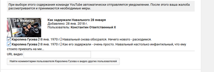 4. Вставляем в поле "Url видео" урл (ну это то, что у вас сейчас в адресной строке) на видео или его ID. После нажатия на бокс "Найти комментарии пользователя", вам покажут все комментарии пользователя под этим видео. Выбираем необходимые. Обычно боты пишут по два или больше, так что задумайтесь, если комментарий всего один.