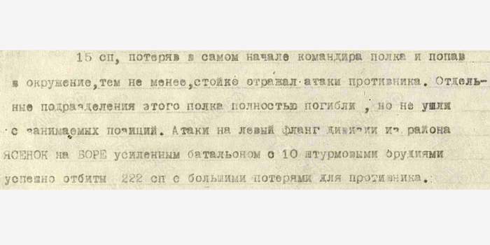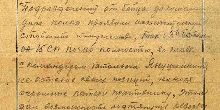 3-й батальон 15-го СП капитана Янушкина погиб в полном составе в своих окопах, его бойцы отчаянным сопротивлением выгадывали время для своих товарищей. Когда два дня спустя наши бойцы пробились к КП 3-го батальона, они нашли капитана Плохотнюка, сжимавшего гранаты мёртвыми руками. Рядом у разбитого противотанкового ружья лежал командир роты — младший лейтенант Блинников.