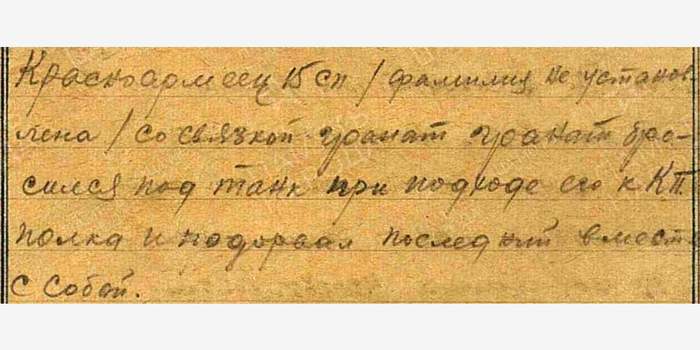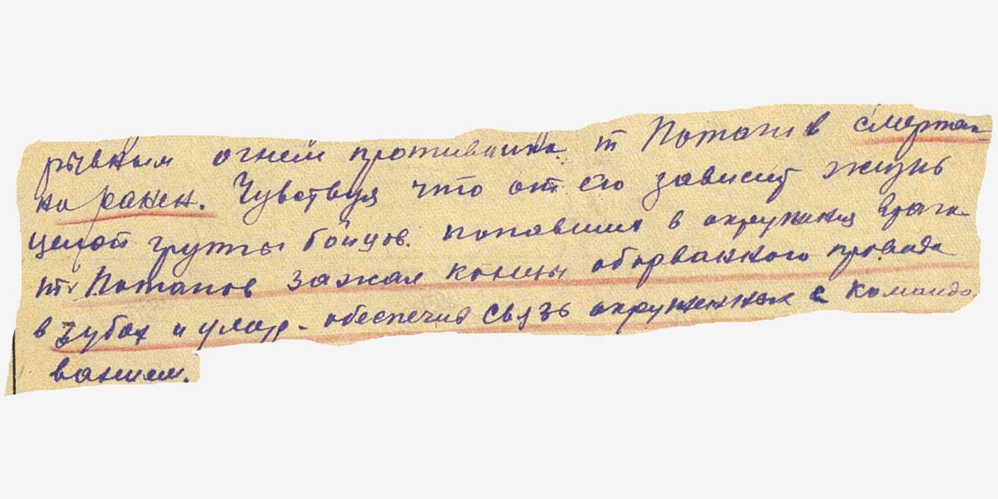 Красноармеец-телефонист Потапов, смертельно раненый осколком немецкого снаряда, зажал оголённые концы зубами и умер, став частью линии связи.