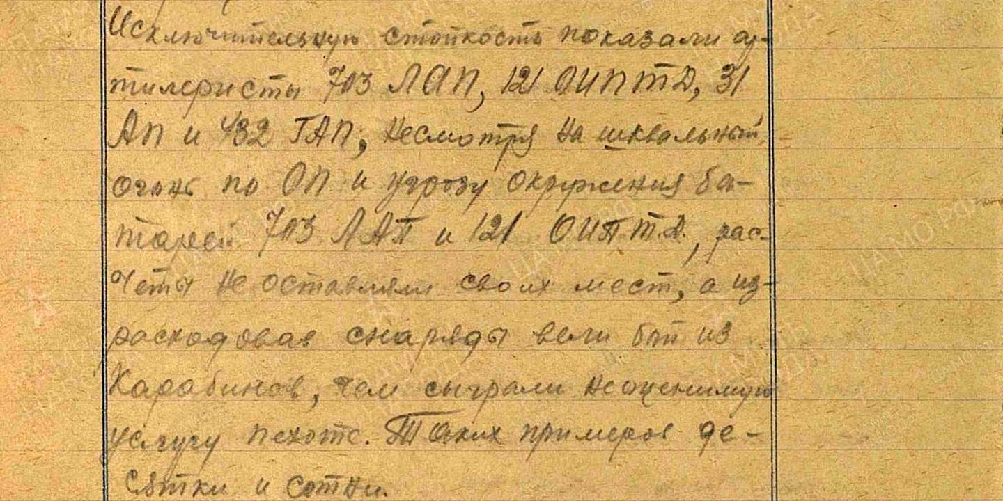 Артиллеристы дрались до конца — сухие строки в ЖБД 49-й стрелковой дивизии отмечали, что пушкари проявили «исключительную стойкость». Несмотря на шквальный огонь противника и угрозу окружения, расчёты не оставляли своих орудий, а после израсходования снарядов или потери материальной части продолжали бой, сражаясь наравне со стрелками.