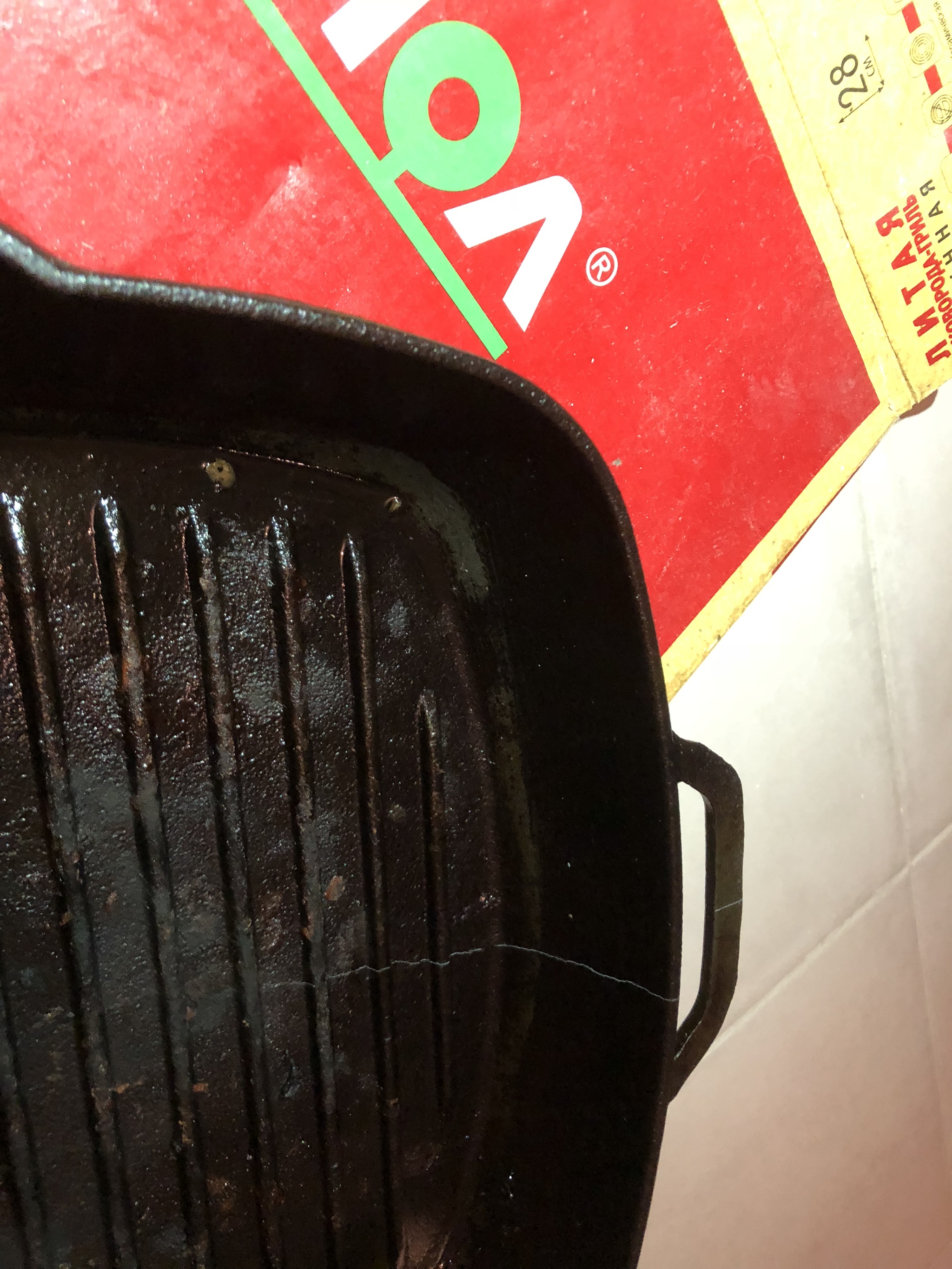 Сегодня готовил мясо на любимой сковороде гриль, купленной в 2018 году. Как вдруг раздался щелчок и, что я вижу... моя сковородка лопнула( как такое может случиться? Она же чугунная.