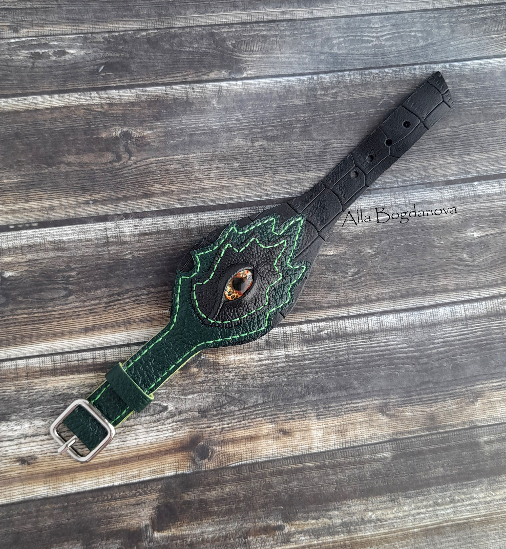 Приветствую всех) Сегодня показываю браслет, который делала года три назад. Увидела в интернете подобные штуки с кабошоном как глаз дракона, стало интересно самой попробовать. Получилось несколько разных, у этого самый маленький размер, можно сказать на подростка) У меня тонкие руки, так что мне подошло тоже. А вообще размер регулируется примерно до 18 см. Материалы: кожа КРС разного цвета и фактуры, пряжка металлическая, стеклянный глаз. Прошивала армированными нитками вручную. Толстые нитки, которыми обычно шьют кожу, я не люблю и с ними не работаю. Выкройки для своих изделий делаю сама. А вообще мне понравился сам процесс создания, да и результат)))